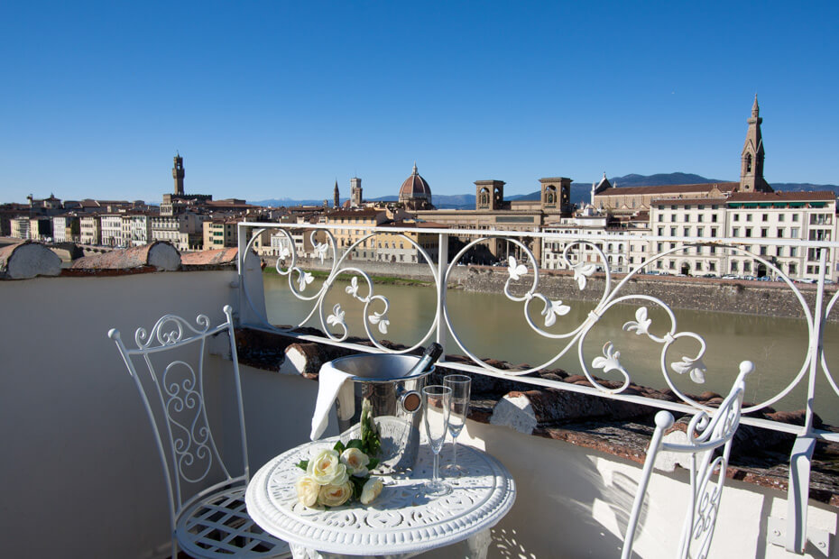 La vista si apre sull’Arno, sui giardini, sui tetti dorati dal sole.